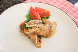 7.皿に盛り付け、トマトとしその葉を飾って完成"